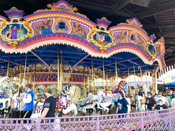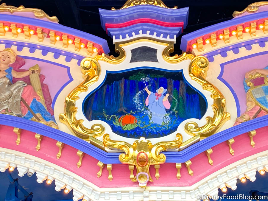 Over in Fantasyland, Prince Charming Regal Carrousel is getting some touch-ups. You can spot new gold leaf painting on the top of the carrousel, around the pictures from the movie. The sparkly paint surrounds images of Cinderella’s wedding…