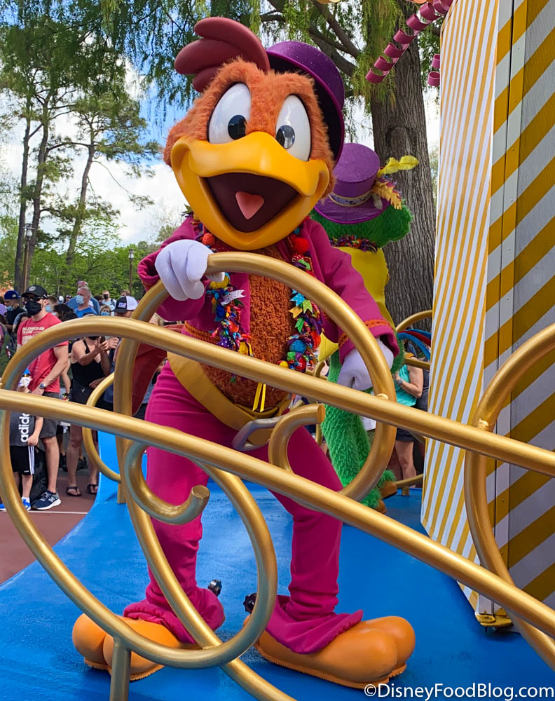 We ran into LOTS of characters as we were walkin’ around the park! On our way in, we caught the Mickey cavalcade, where the main mouse and his pals gave us a big ol’ wave.