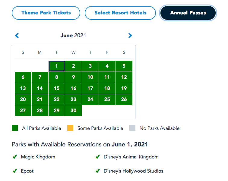 Park Passes for July appear to still be available at all of the parks for guests with Theme Park Tickets, Select Resort Hotel Guests, and Annual Passholders.