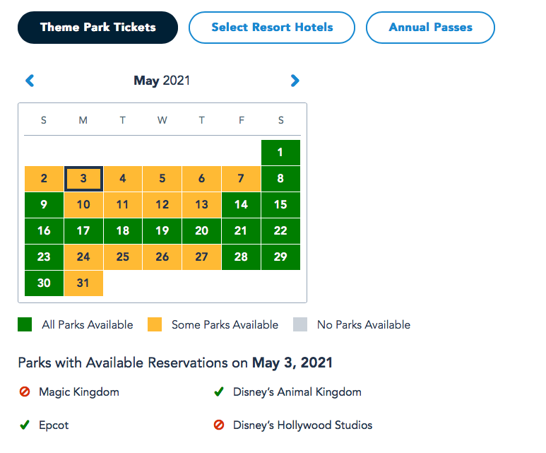 Annual Passholders, on the other hand, are looking a bit better in May…for now. Right now, only Magic Kingdom Park Passes have filled up for May 1st and the rest of the month is still green (meaning there is full availability at all of the parks).