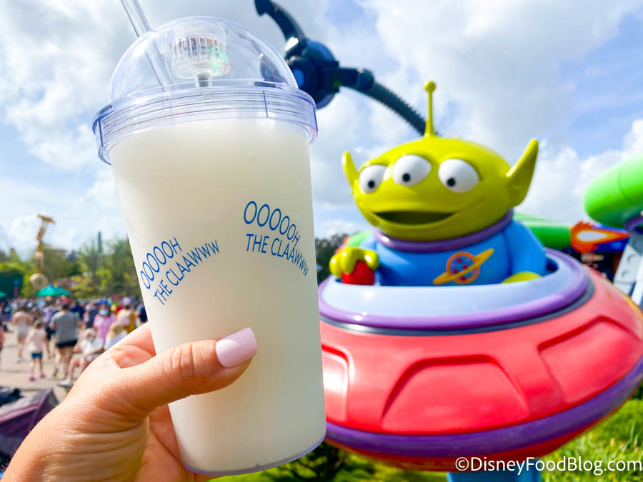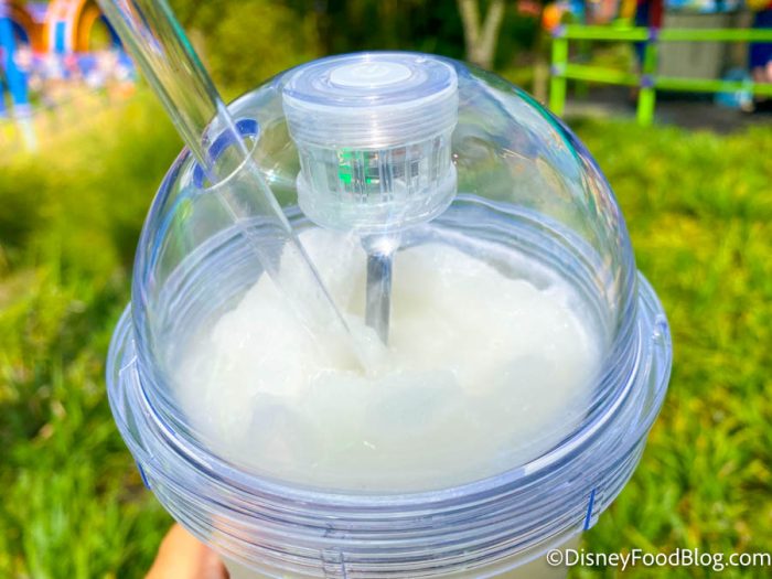 The grand total of this slush and cup is $16.50, or you can get the alien sipper for $10.50 on its own. We’ve also seen this cup sold at Woody’s Lunch Box and other locations around Walt Disney World (and even Disneyland Resort in the past). If you buy this over at Woody’s Lunch Box it will be served with the Frozen Mystic Portal Punch.