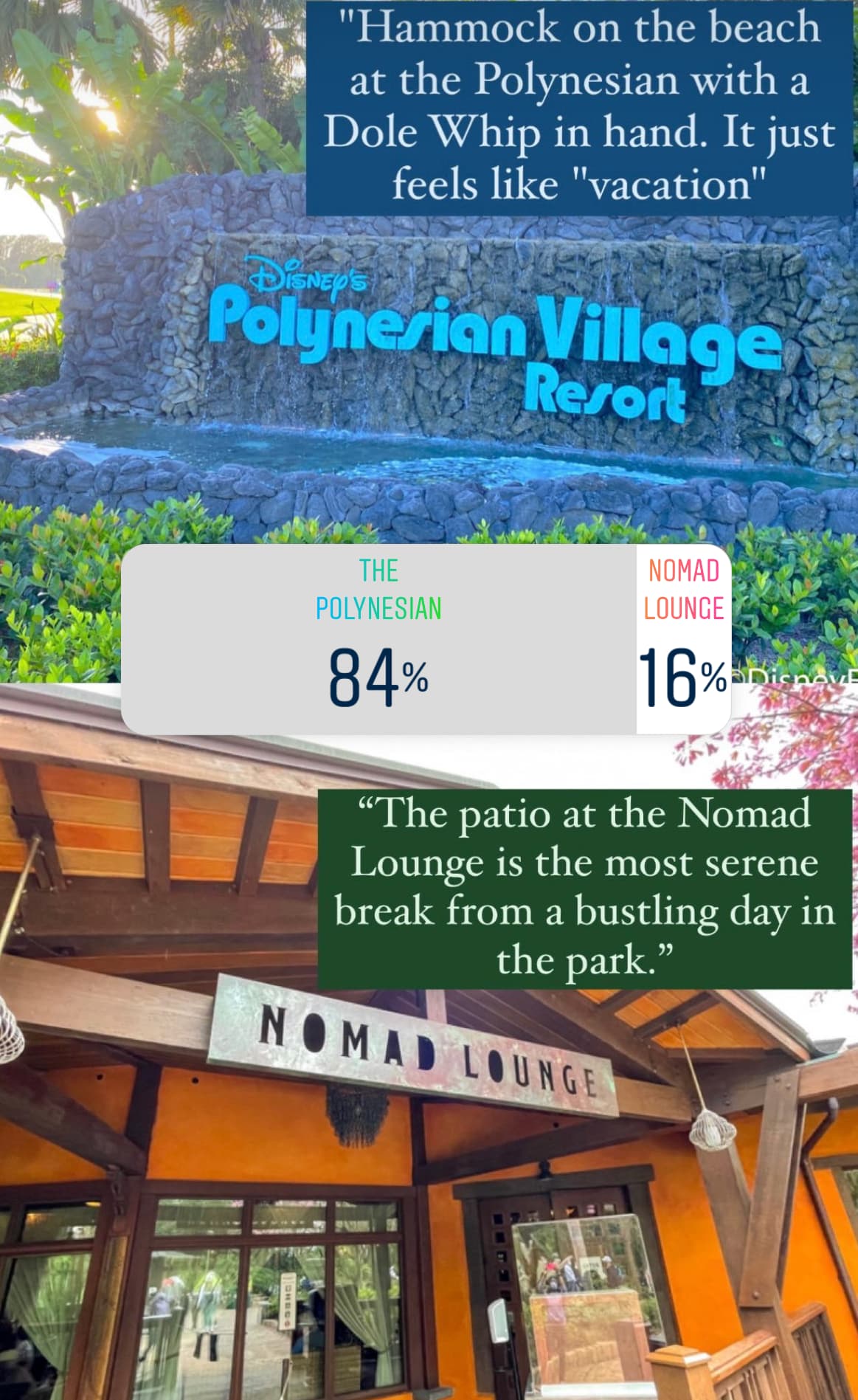 Lastly, we put the beach (with a Dole Whip) at Disney’s Polynesian Village Resort up against Nomad Lounge in Disney’s Animal Kingdom. And, the Polynesian won with no problem, earning 84% of the votes. We’re happy to see one of our favorite spots to grab a Dole Whip stick around!