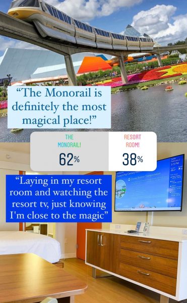 At Disney World, even spots outside of the park can be a special place, so we pitted the monorail against a Disney World Resort hotel room. And, the competition was a little tighter on this one! But, the calming sound of a monorail gliding through the sky won out in the end!