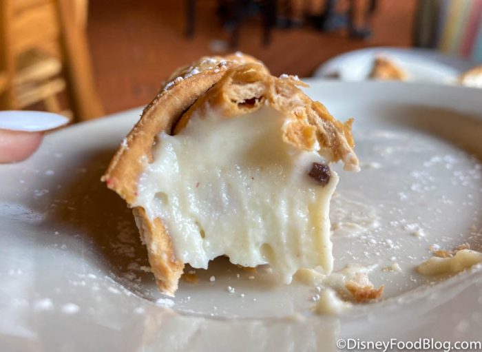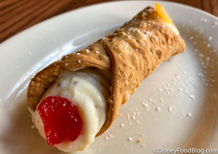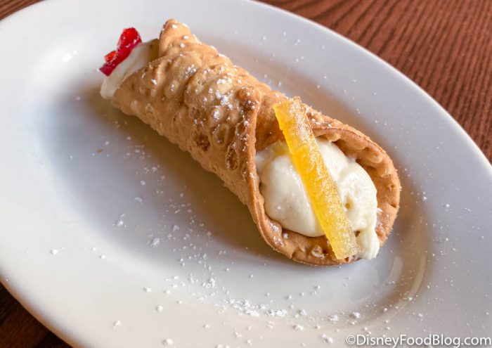 We do prefer this cannoli to other, rather disappointing, cannolis at Disney World. (To say we’ve been underwhelmed by Disney World cannolis in the past would be an understatement!) It’s not too sweet, the little hits of candied zest and chocolate were welcome, and we were satisfied after eating it. Plus it was fresh. Though, if you’ve got room for dessert and you’re not a huge fan of cannolis, there are much better desserts elsewhere in EPCOT. We’d probably skip this dessert and head over to get some caramel-covered goodies in the Germany Pavilion.