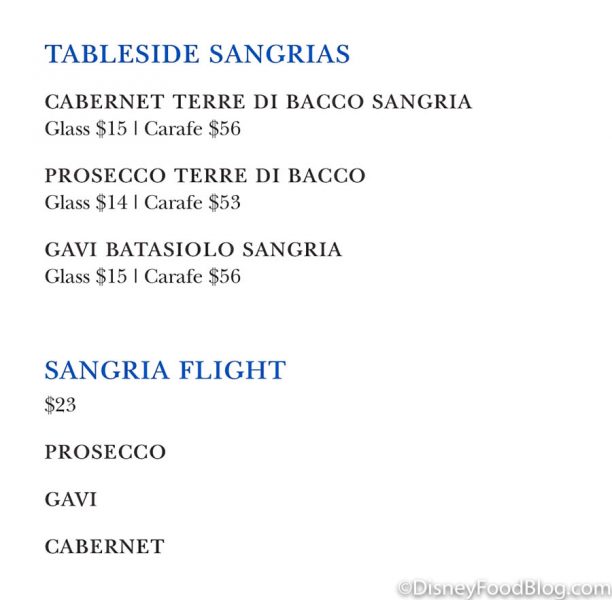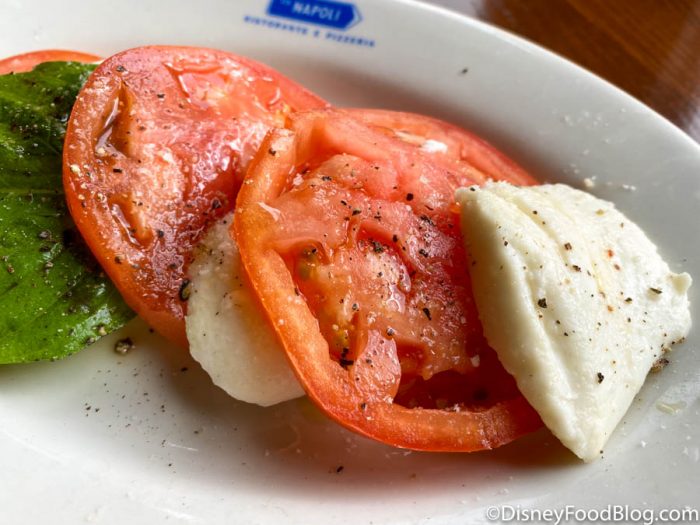 This starter dish has fior di latte mozzarella, vine-ripened tomato, and basil and is on the menu for $12. We were surprised to see that there was no balsamic sauce to top the dish off but it was instead drizzled with olive oil, salt, and pepper. While many traditional Caprese salads DON’T add balsamic, most at Disney World do. If the tomatoes and cheese can stand on their own though, there should be no need to punch up the flavor with vinegar. The best part of this dish, you ask? The chunks of delicious cheese! (Duh.)