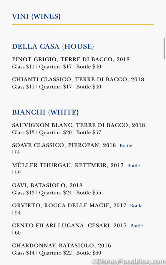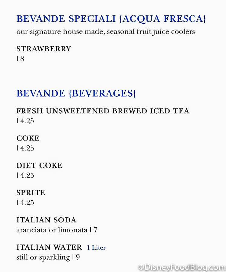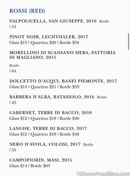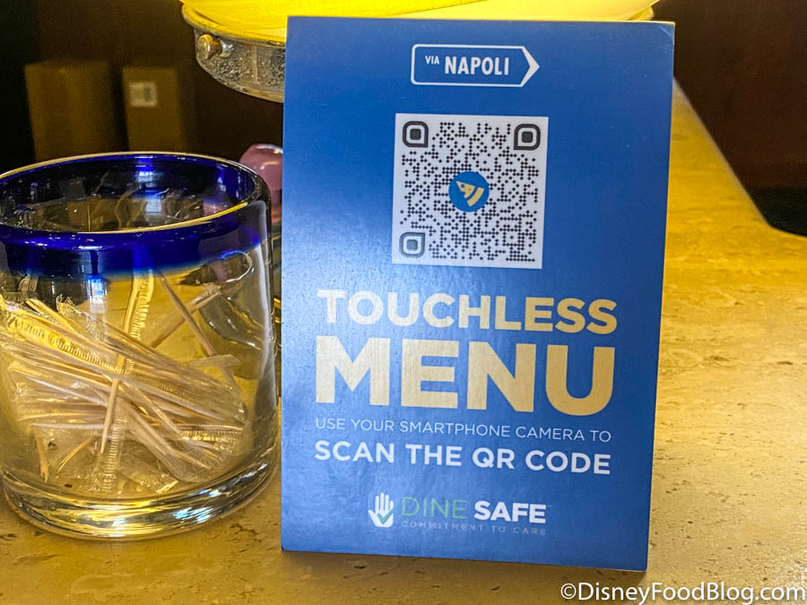 Like most restaurants at Disney World, Via Napoli has made their menu available via QR code. Gone are the days of paper menus! When you sit down, the server directs you to scan the QR code that is located on the placard in the middle of the table. Once you scan the code, the whole menu pulls up on your phone so you can scroll through.
