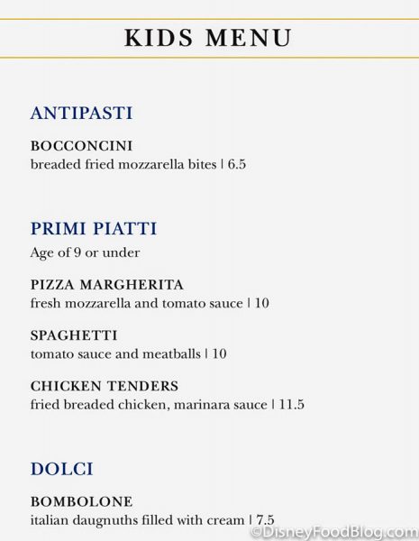 The kids’ menu does feature one additional appetizer, Bocconcini, aka fried mozzarella bites (which we like a lot).