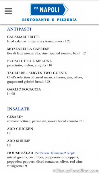 - If you have a dairy or gluten allergy Via Napoli’s expansive menu suddenly becomes quite limited. While the restaurant does have an allergy-friendly menu, there are other locations at EPCOT that have a better menu for those with those food restrictions.