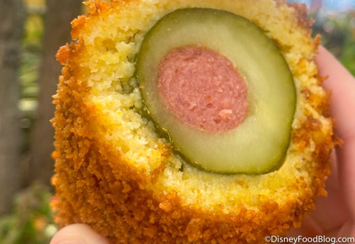 And if you don’t shy away from the strange combination of flavors, you’ll find that they work together surprisingly well! The peanut butter adds a nice of element of sweetness, and at least in our experience, the pickle juice didn’t make the breading all soggy. However, you won’t get the same proportion of ingredients in every bite. And the hot dog had the faintest taste of all!