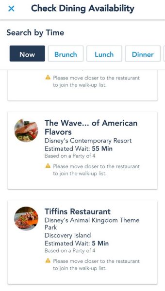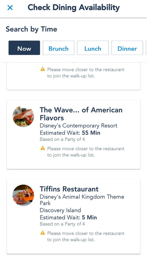 With this feature, you can check what restaurants have walk-up spots available and what your estimated wait time would be. Just start by hitting the “Now” button when checking for dining reservations in My Disney Experience!