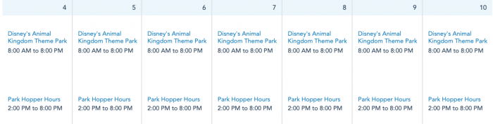 Finally, Disney’s Animal Kingdom will be open daily next week from 8AM-8PM.