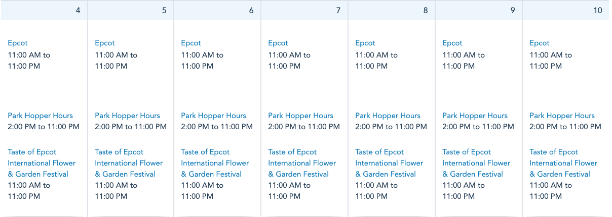 EPCOT will be open daily from 11AM-11PM. The Taste of EPCOT International Flower and Garden Festival will also be open daily for guests from 11AM-11PM.