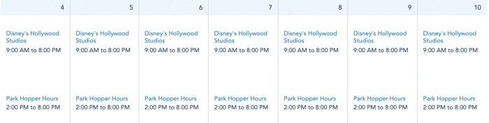 Disney’s Hollywood Studios will be open daily next week from 9AM-8PM.