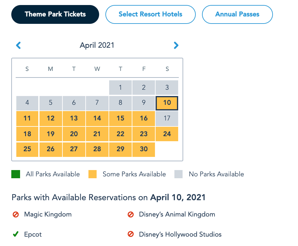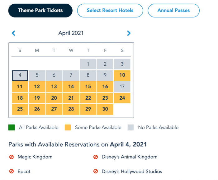 Currently, guests with Theme Park Tickets (those not staying at Select Resort Hotels) cannot book any Park Pass Reservations from Sunday, April 4th through Friday, April 9th.