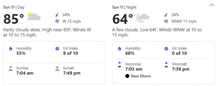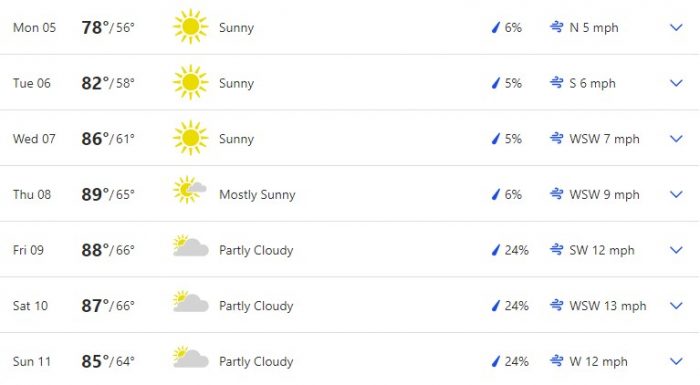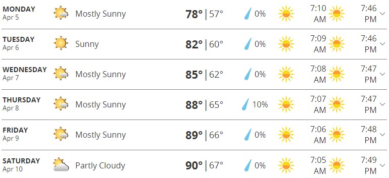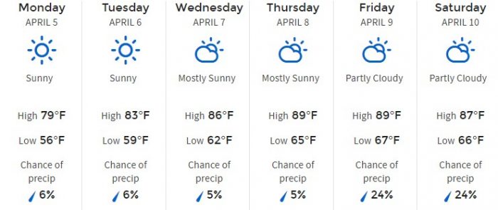 Here is a full overview of the week according to The Weather Channel. Temperatures are projected to be pretty stable for daytimes over the week with some cooler evenings. We’re looking at a range of 70s to 80s highs and 50s to 60s lows. We can’t wait to leave those 50s in the past! Although, we can’t say we’re quite ready for 90-degree days.