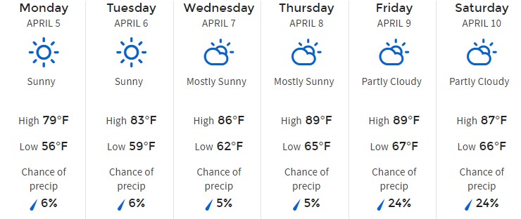 Monday, April 5th will start the week with the lowest temperatures. That day is going to max out at a 78-degree high and we’ll see 56 degrees at night.
