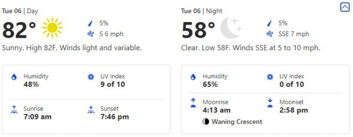 The next day, April 6th, brings us warmer temps hitting a comfy day at 82 degrees during the day and keeping that low down at a cool 58 degrees.