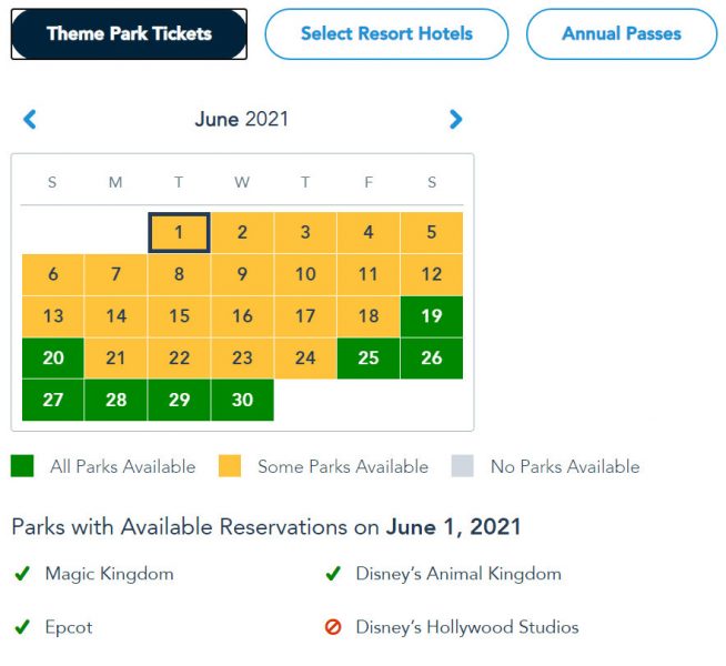 When we looked at the park pass availability calendar on Disney World’s website, we noticed something HUGE — park passes for June are going fast! If you look at the calendar below, you’ll see that Hollywood Studios is already booked up for most of the month for Theme Park Ticket and Select Resort Hotel guests.
