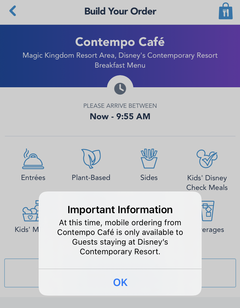 We also noticed the same message when we pulled up the Mobile Order screen for Contempo Cafe, also located at Disney’s Contemporary Resort.