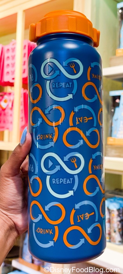 For something sturdier, try the metal water bottle. It’s large and dark blue, with the words “Eat, Drink, Repeat” interspersed with colorful arrows! This one sells for $34.99.