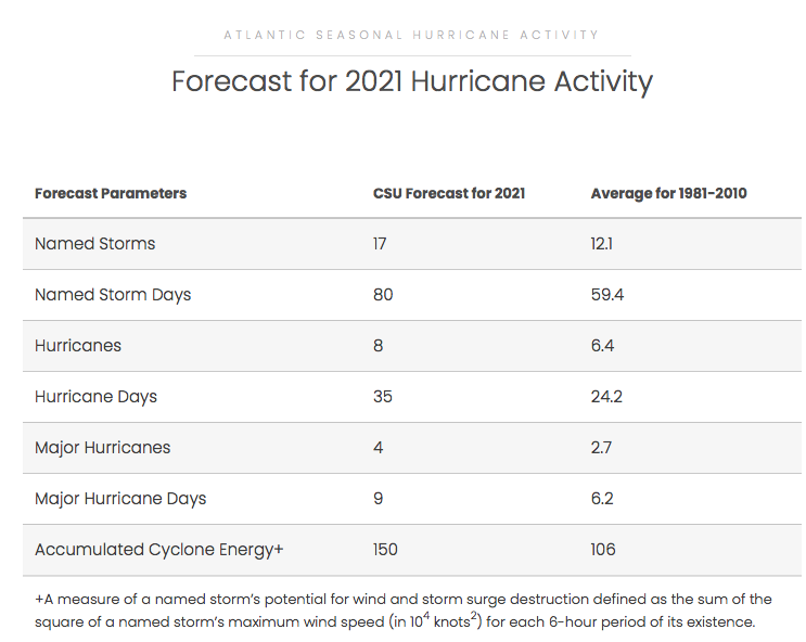 Keep in mind that while the official hurricane season does begin on June 1st, the last 6 consecutive Atlantic hurricane seasons have started with storms prior to this date — and it’s looking like 2021 will be no exception. Now, Colorado State University (CSU) has predicted an “above-average Atlantic hurricane season in 2021,” citing the absence of El Nino as a primary factor.