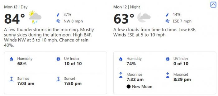 Here is a full overview of the week according to The Weather Channel. Temperatures are projected to be pretty stable for daytimes and evenings over the week. We’re looking at a range of 70s to 80s highs and 60s lows. Finally, no more 50-degree nights!