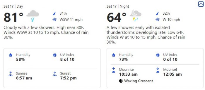 Saturday, April 17th brings us slightly cooler temps in the low-80s and. YEP, we’ve got some rain.