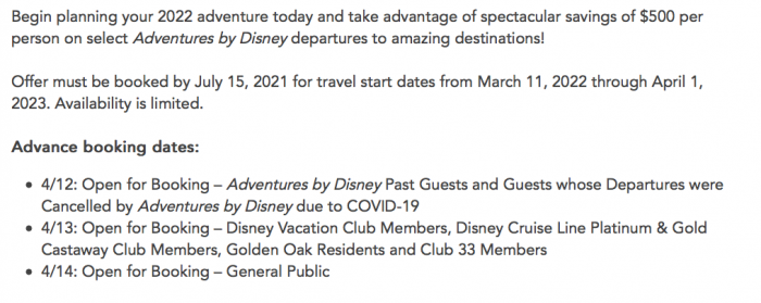 When can you get booking? Well, advance booking begins on April 12th, 2021, for Adventures by Disney past guests and guests whose departures were canceled by Adventures by Disney due to COVID-19. On April 13th, booking then opens up for select individuals like Disney Vacation Club Members, Golden Oak Residents, and more.