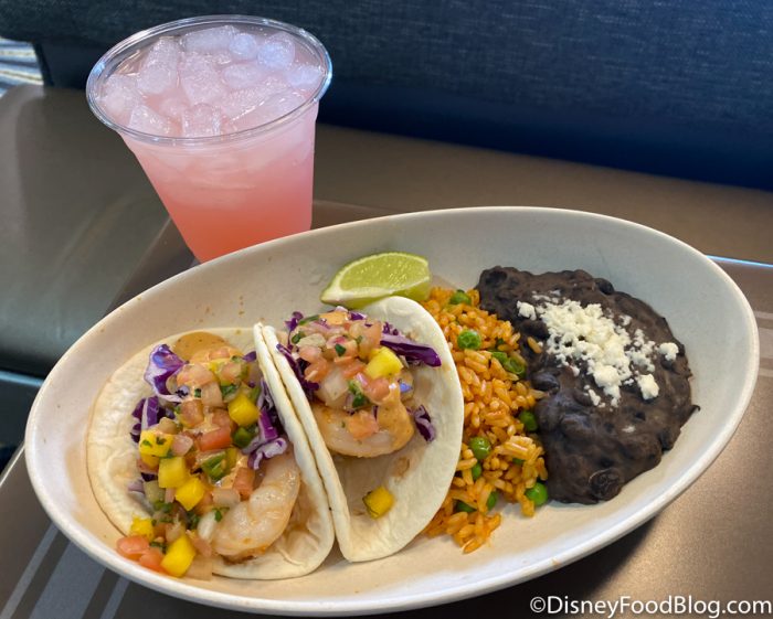 Some of the items on their menu currently are the Shrimp Tacos for $12.99, the Curry Rice Bowl with Shrimp for $13.99, the Buffalo Chicken Grilled Cheese Sandwich for $10.99, and the Pork Carnitas Tacos for $10.99. Each of these options offers some great variety from the basic theme park food like hot dogs and burgers.
