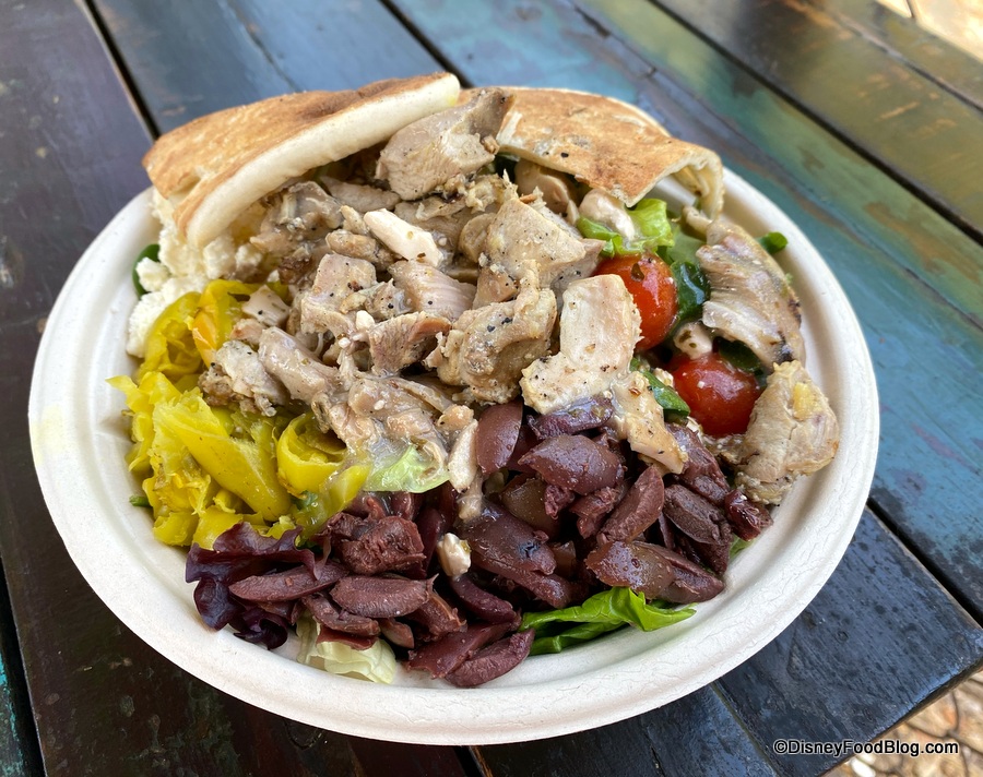 Here, you’ll find choices like the Ribs and Chicken Bowl for $14.29, the Grilled Chicken Bowl for $11.79, and the Harambe Salad with Chicken for $11.99. The options here feel a LOT healthier than most things we’ve found in the theme parks, so we don’t feel quite so bad after our meal! That said, they’re still loaded with fresh ingredients, and really hearty and filling.