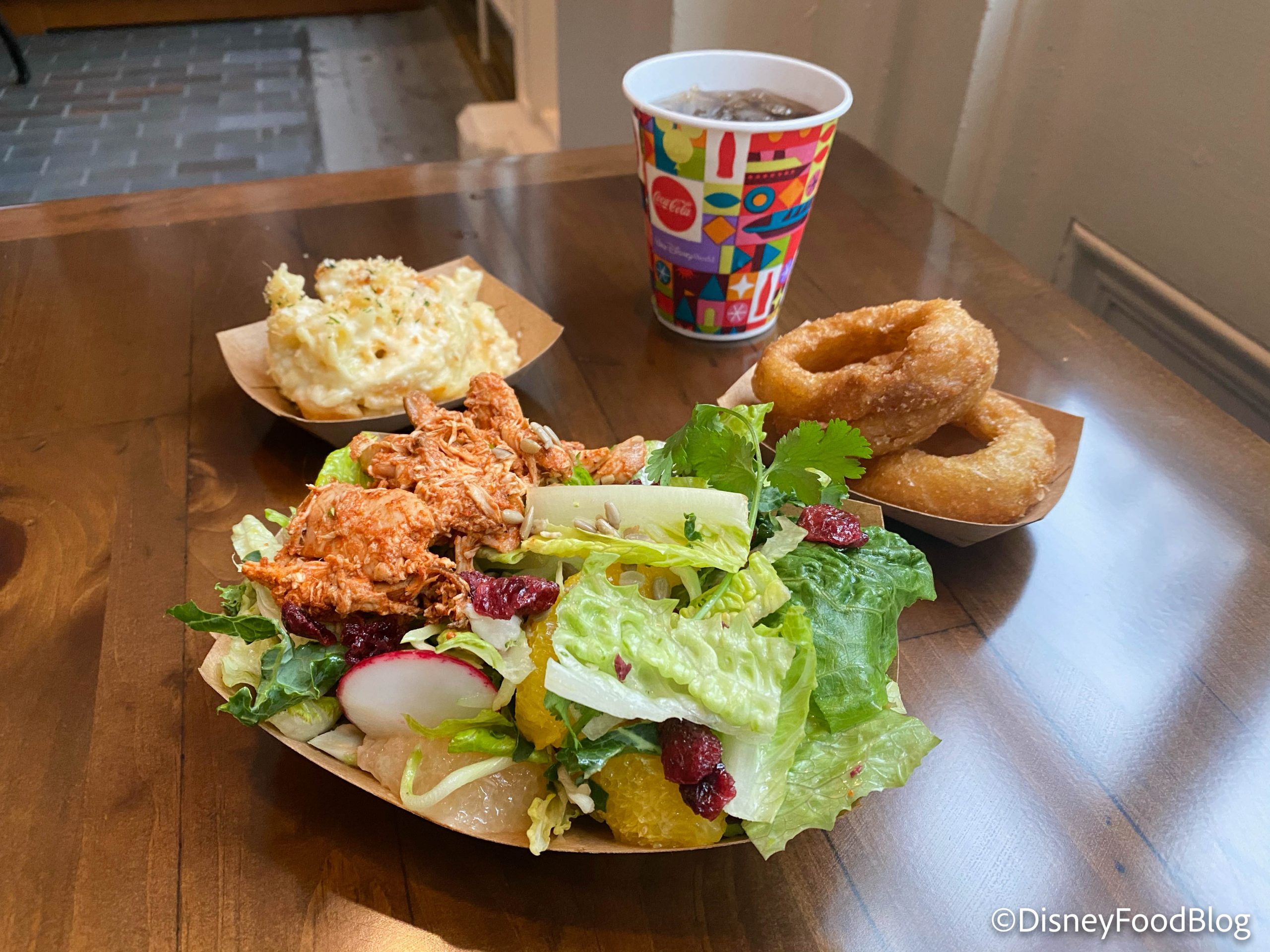 The menu here is bigger than many “fast food” restaurants at Disney World, and while you can score a cheeseburger, there are several more exciting choices. Some of those include the Chicken Nachos for $10.99, the Pork Carnitas Nachos for $10.99, the Chicken Rice Bowl for $11.99, and the Southwest Salad with Pork Carnitas for $11.99.