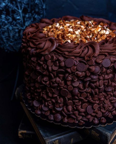 It’s a chocolate cake coated with orange simple syrup and a THICC layer of orange-infused dark chocolate fudge buttercream. The sides are heaped with dark chocolate chips, and the top is sprinkled with pecans and candied orange pieces from the Stuart’s Cookie.