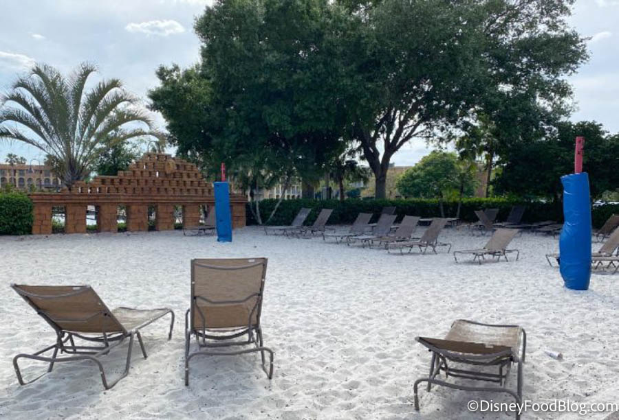 Next to the Dig Site Pool, we noticed that the net was removed from the volleyball court, but several chairs were added for sunbathing.