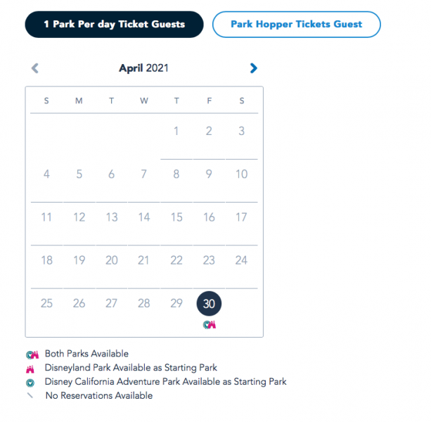 This shows whether reservations are available for one or both parks on each day depending on whether you are a 1-park per day ticket guest or park hopper tickets guest.