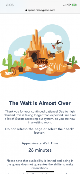 Now, that’s the wait time on our laptop. We were also in the virtual queue on our phone, and the wait time there showed just 26 minutes. We joined on our laptop first, so it seems to be random how quickly you move through the queue.
