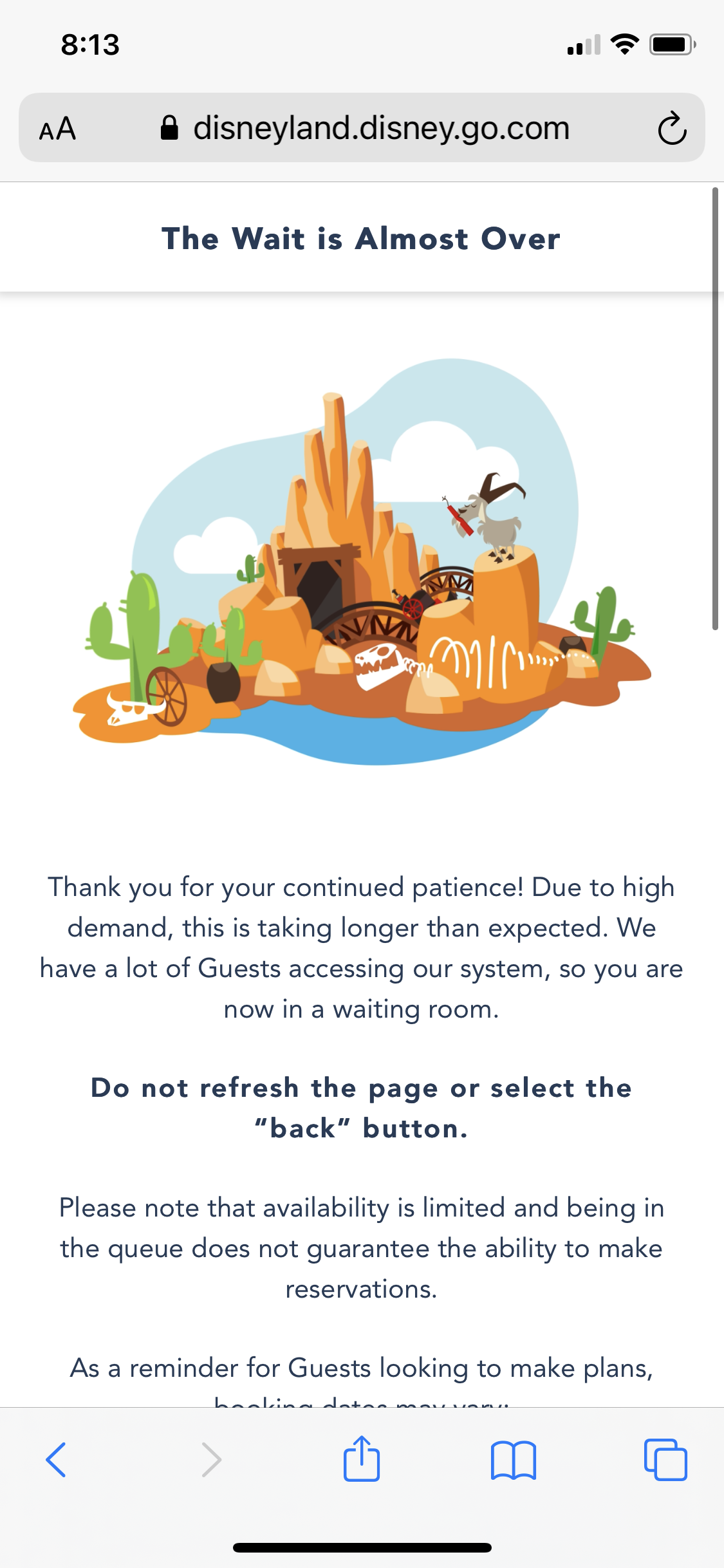 I waited over 10 hours today. Initially I got on right at 8 AM it was done by 8:15, but my username and password wasn’t working so it kicked me off. I hopped back on by 8:30 and we did over 10 1/2 hours 😳. I have my tickets! Now how the heck to I reserve my dates? It seems as though they placed me in yet another Que (which I have been in now for another 2 hours)! Ridiculous! Not to mention that I paid over $750 for five people to attend a Disneyland for one day.