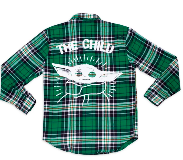 Baby Yoda fans: plenty of Grogu gear is on sale, too! The Child Flannel Shirt is a green plaid with text on the back that reads “The Child.” There are some cute details here, too: an embroidered Star Wars logo on the pocket and a frog on the collar.