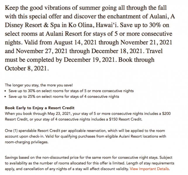 To take advantage of this offer, you’ll need to book your stay by October 8th! Certain rooms are excluded and there are other specific terms that apply, so be sure to check out the full details on the Aulani website for that.