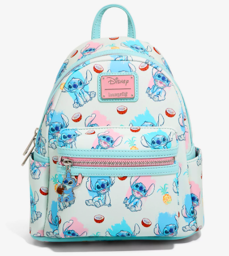 The last bag has a more tropical feel. The Lilo and Stitch Coconut Loungefly Backpack features Stitch himself along with (you guessed it!) coconuts. The soft pinks and blues are super beachy!