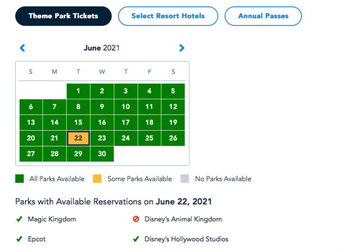 Just yesterday, the Park Pass availability calendar for guests with Theme Park Tickets was looking mostly yellow (meaning passes for one or more parks had already filled up on those days) and one day was even entirely booked for all 4 parks.