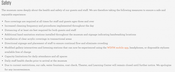 Lots of health and safety guidelines will be in place at the museum. Face coverings are required, along with distancing measures, capacity limits, and hand sanitation stations in place.