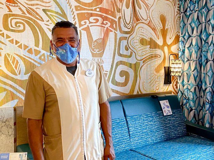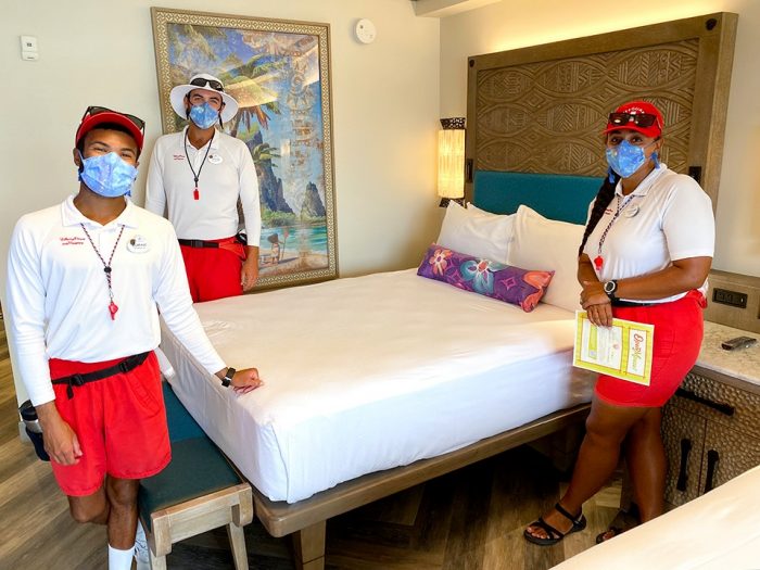 Cast Members were invited to check out the new guest rooms at the Polynesian Village Resort, as shared on the Walt Disney World Cast and Community Facebook page! Behind these lifeguards, you can see Moana-themed art and bright pops of color in the room, like we saw in the original sneak peek of the rooms. Plus, the bed’s headboard is filled with intricate designs and details.