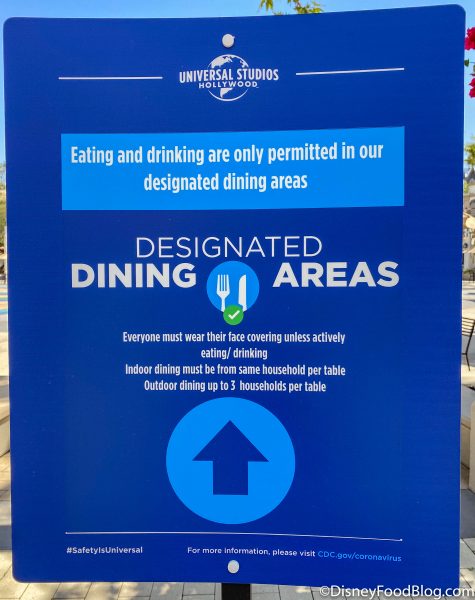We also spotted a sign in the park with some specific dining rules. Eating and drinking are only allowed in designated dining areas at Universal Studios Hollywood. Everyone must wear their face coverings unless they are actively eating or drinking.