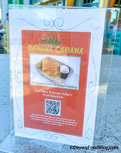 We have been fans of the O’hana bread pudding (OBP) since DFB turned us on to it and have recently had the equally delicious slice at Kona Cafe due to O’hana’s stubborn refusal to re-open! On our most recent excursion to Orlando, we popped into Banana Cabana on a whim (we were actually going to Sebastian’s Bistro not realizing that IT TOO was still closed (are Stitch and Sebastian still in quarantine?)! We were, however, seated INSIDE of Sebastian’s Bistro even though we were still ordering off of BC’s menu. I know, it’s sounds confusing to me and I was there!