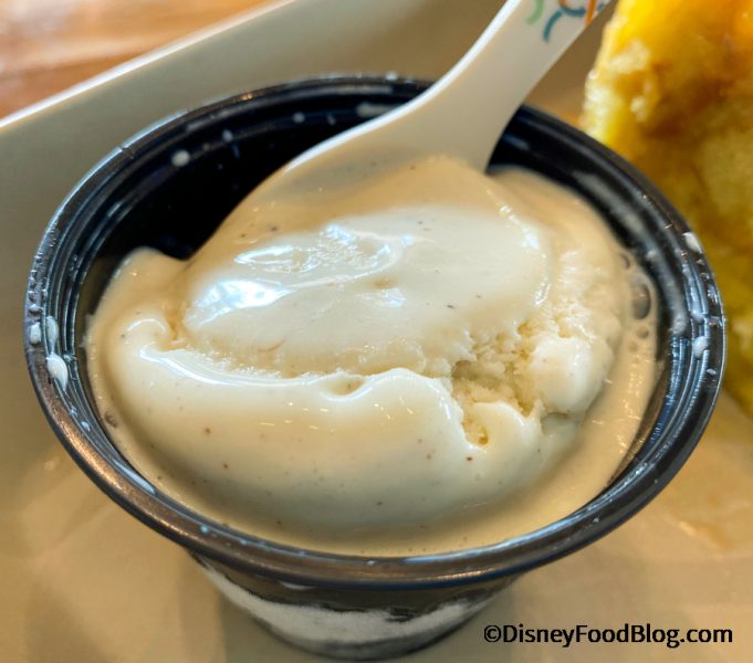 So let us introduce the Pineapple-Coconut Bread Pudding at Banana Cabana at Disney’s Caribbean Beach Resort. So yeah, we HAD to dig into that! This wonderful dessert is Pineapple Coconut Bread Pudding with a Caramel Sauce — AND it comes with a side of vanilla ice cream.