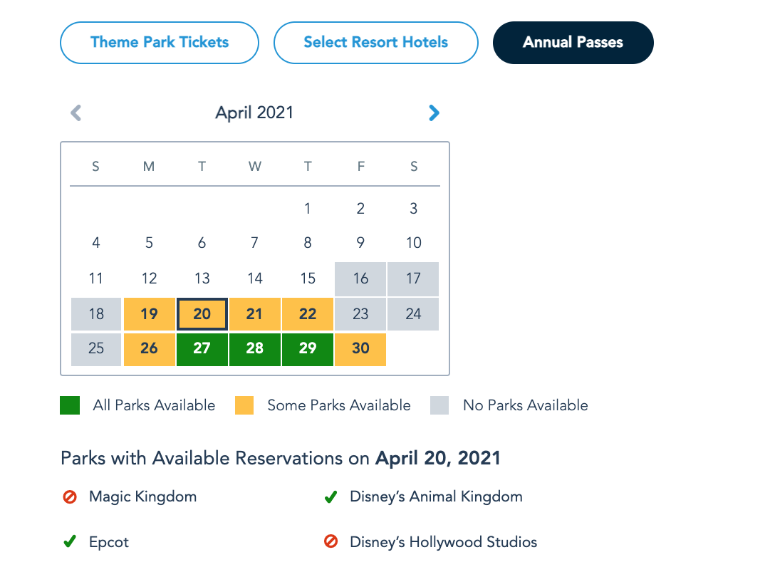 Current Park Pass Reservation availability for Annual Passholders on April 20th as of April 16th © Disney