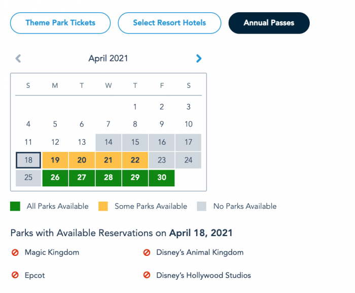 Current Park Pass Reservation availability for Annual Passholders on April 18th as of April 14th © Disney