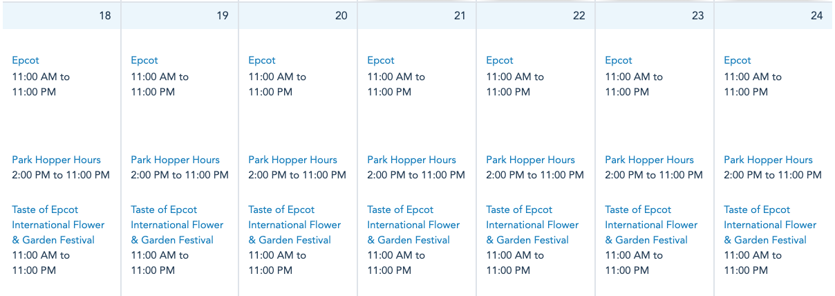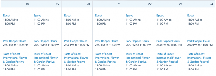 EPCOT will be open daily next week from 11AM-11PM. The Taste of EPCOT International Flower and Garden Festival will also be open daily next week from 11AM-11PM.