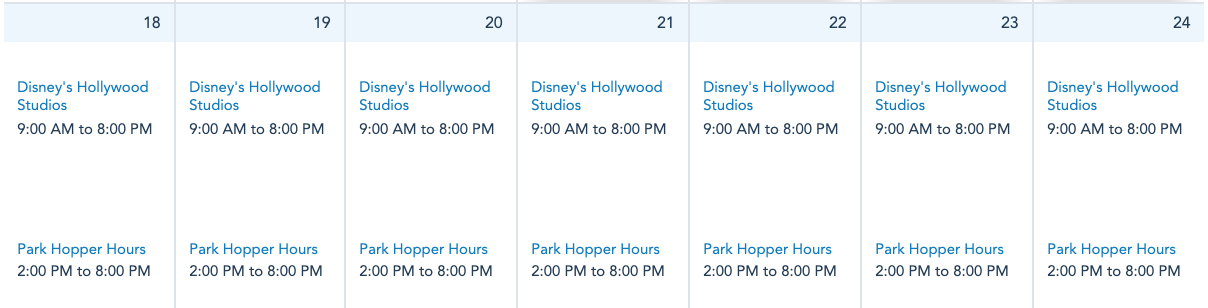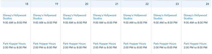 Disney’s Hollywood Studios will be open daily next week from 9AM-8PM.
