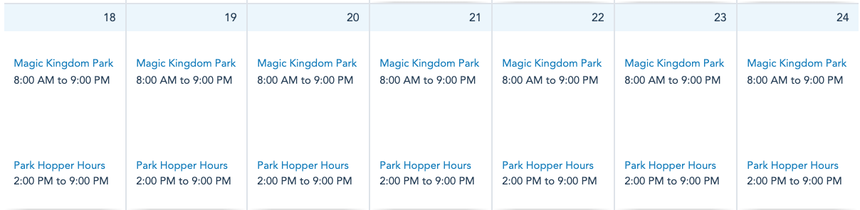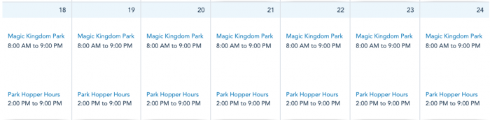 This week’s park hours are the same as the week prior. Magic Kingdom will be open daily from 8AM-9PM.